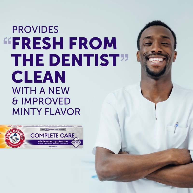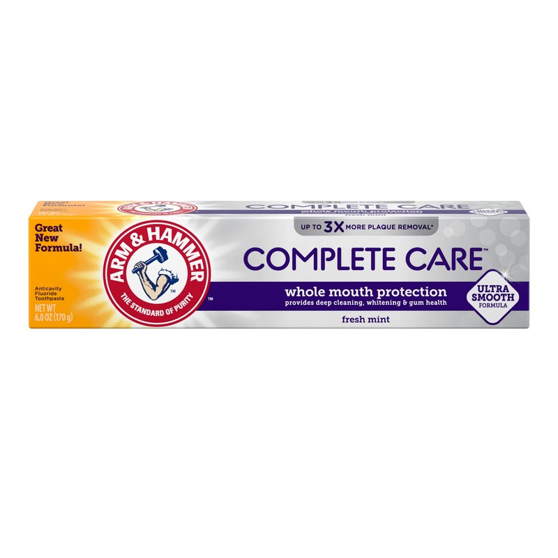 ARM & HAMMER Complete Care Toothpaste delivers complete care for a healthier mouth. This multi-benefit toothpaste is specially formulated to help maintain healthy gums as well as protect against tartar buildup. It contains fluoride to prevent cavities and strengthen teeth, while baking soda provides proven whitening power in a low-abrasion formula. The baking soda also neutralizes acids that weaken and erode enamel. For stronger, healthier teeth and gums and a whiter smile, brush with ARM & HAMMER Complete Care Toothpaste.