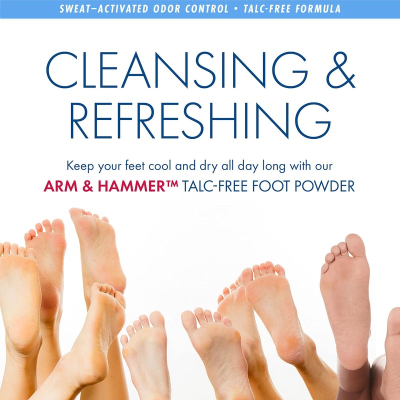 - Cleansing & Refreshing - Keep your feet cool and dry all day long; Arm & Hammer Talc-Free Foot Powder eliminates odor on contact, absorbs moisture, and keeps your feet feeling soft with soothing corn starch powder