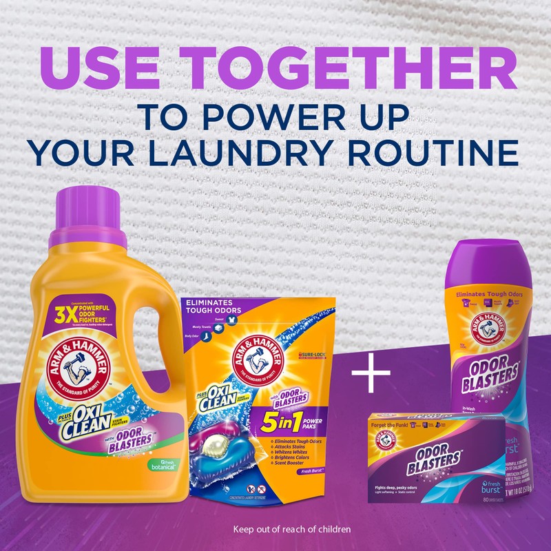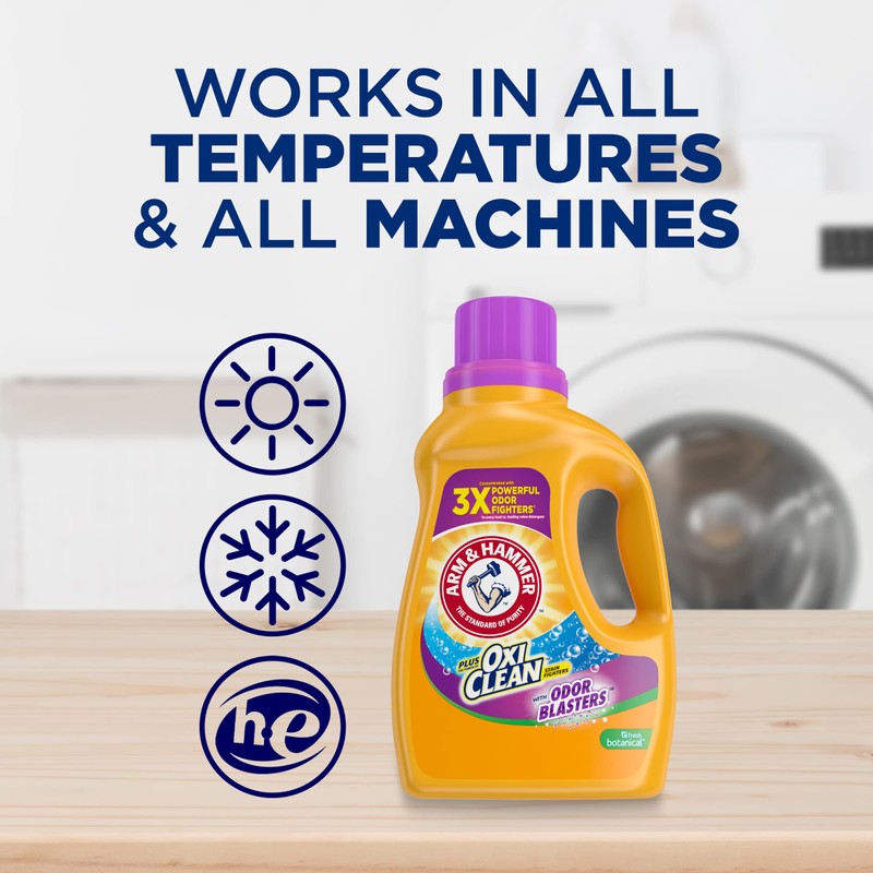 - One 100.5 fl oz bottle of ARM & HAMMER Plus OxiClean with Odor Blasters Laundry Detergent, Fresh Botanical Liquid Laundry Detergent cleans 77 medium loads when used as directed