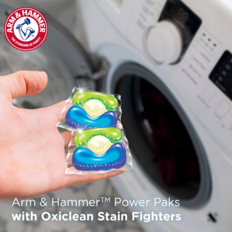 Arm & Hammer Plus OxiClean 5-in-1 power pads offer 5 powerful cleaning benefits in 1: attacks stains, fights odors, whitens whites, brightens colors, with a powerful fresh scent booster. Powered by OxiClean Stain Fighters to remove 100+ stains leaving clothes clean and smelling great. Get effective cleaning power with Arm & Hammer Plus OxiClean 5-in-1 power Paks, designed to work in all temperatures and all machines. Drop one in today!