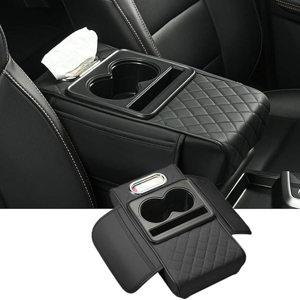 Arm Rest Cover for Car, Microfiber Leather Car Center Console Cover with 2 Storage Bags, 2 Cup Holders and a Tissue Box, Universal Car Console Covers Accessories, Black