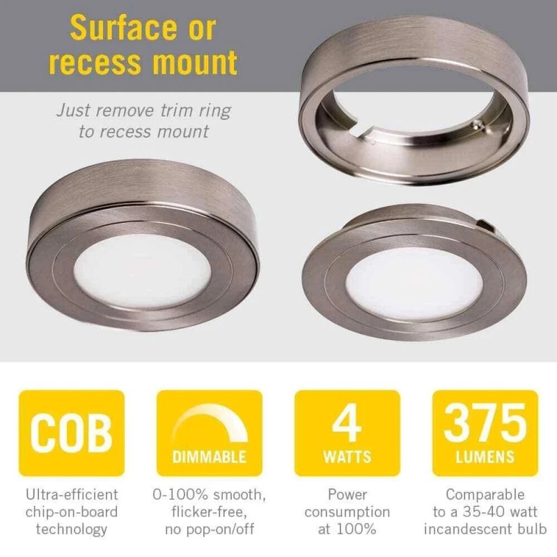 - Energy-Efficient: The LED puck lights use 12-volt low-voltage power, making the puck lights exceptionally energy efficient