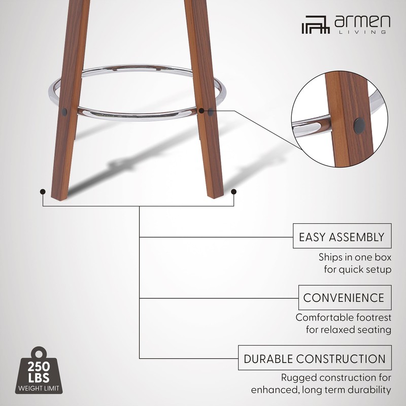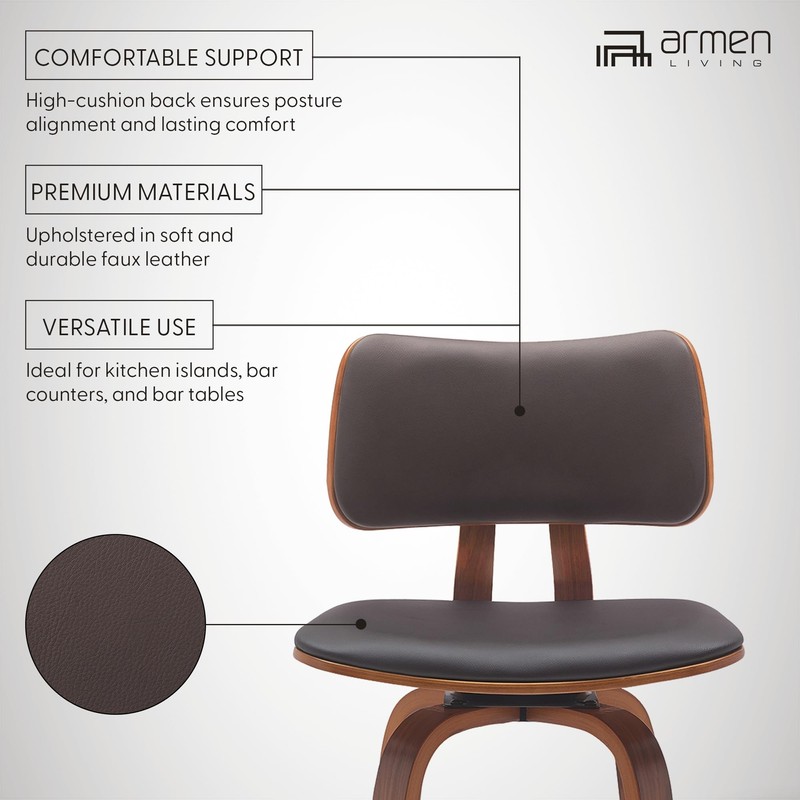 Armen Living Pico 26" Seat Height Mid Century Modern Swivel Walnut Wood Bar Stool for Kitchen Island Counter in Brown Faux Leather with Chrome