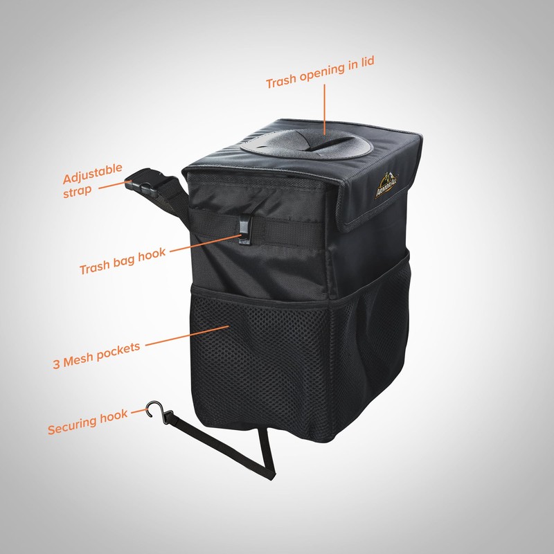 - Hanging Trash Can / Organizer: This multi-use bag serves as both a car trash can and backseat organizer with a secure lid, mesh pockets, and bag hooks for removable liners. Collapsible for space-saving storage, it attaches easily with adjustable straps and a securing hook.