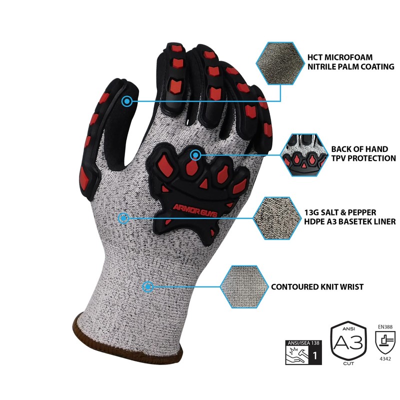 • BASETEK WORK GLOVES: Engineered with a 13g Salt & Pepper HDPE Basetek A3 Liner and Black HCT MicroFoam Nitrile Palm Coating; meets rigorous ANSI A3 Cut Level and EN388:2016 4342 standards; tested to ANSI/ISEA 138: Level 1 for impact protection.