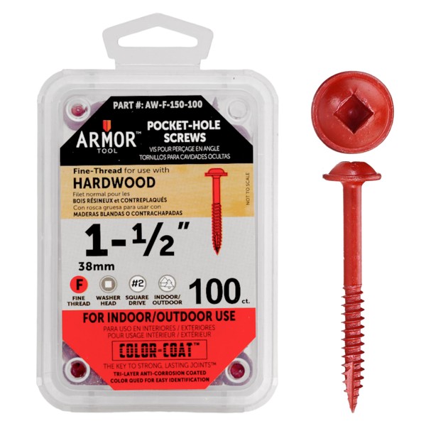 ARMOR TOOL Pocket Hole Screws - 1-1/2" Fine Thread Joinery Screws 100 Pack with Red Color Coat & Square Drive - AW-F-150-100