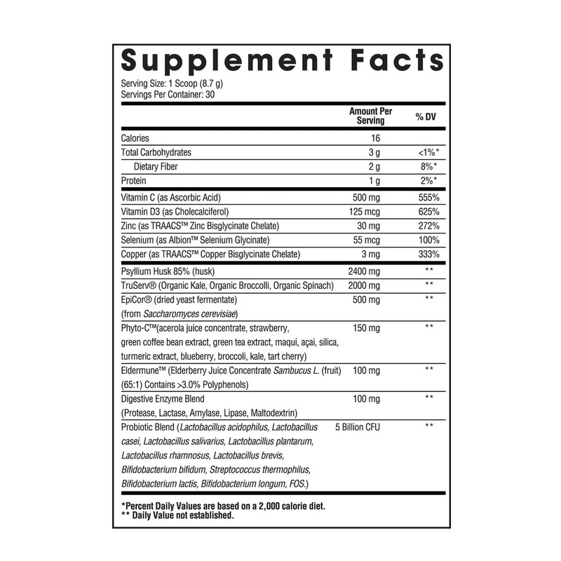 - IMPROVED DIGESTIVE AND IMMUNE SUPPORT. IMMUNITY GREENS contains a blend of TruServ (2000mg), EpiCor (500mg) Phyto-C (150mg), Eldermune (100mg), Digestive Enzymes (100mg), and Probiotics (5 Billion CFU) to support optimal nutrient breakdown, absorption, and immune system function.
