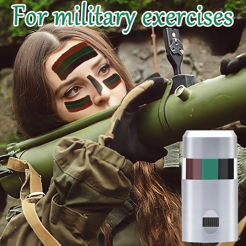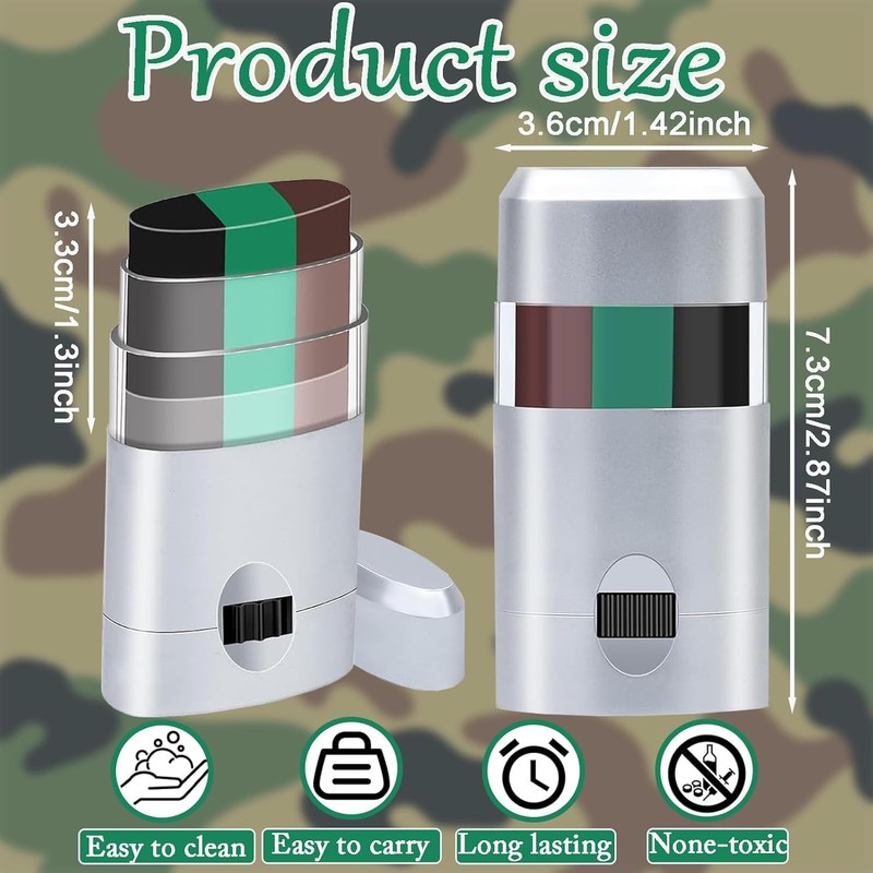3. The rotating design ensures clean and precise application.Army accessories is perfect for quick touch-ups during outdoor activities or events. This camo cream is exquisitely designed and easy to apply and remove. The smooth cream texture is smooth to apply, allowing you to quickly create beautiful patterns. After application, just wash with soap and water, and the cleaning process is easy and convenient