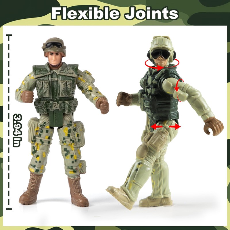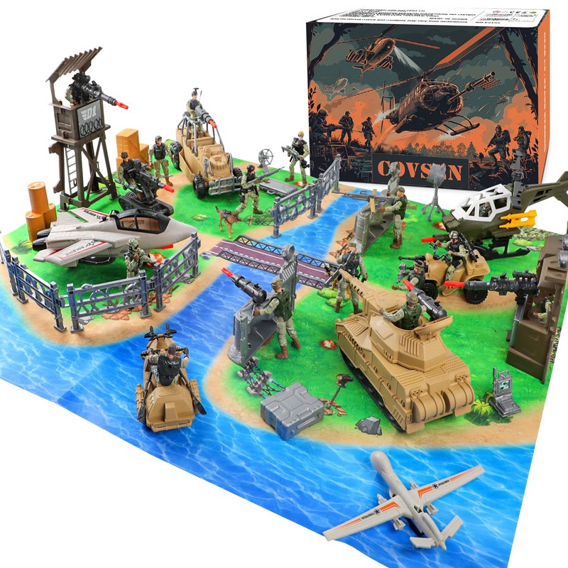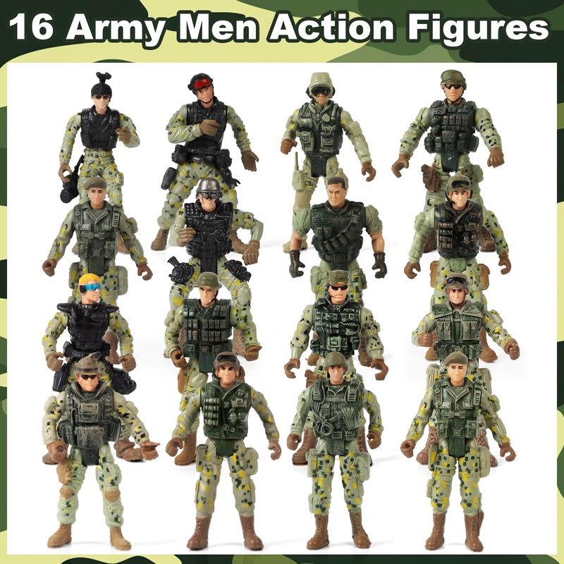 - 【Army Men Action Playset】Unleash the excitement of military missions with our comprehensive playset! Includes 16 Army Men action figures, a combat truck, helicopter, tank with a movable turret, armored car, fighter jet, drone, quad bike, kayak, fortifications, a watchtower, two dogs, and an array of military equipment. With this diverse collection, kids can recreate historic battles or design their own strategic missions for hours of thrilling, imaginative play