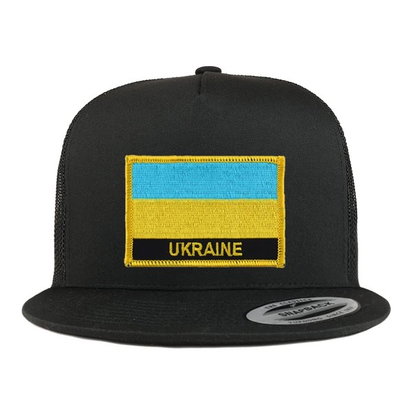 Armycrew XXL Oversized Ukraine Flag Patch 5 Panel Flat Bill Trucker Mesh Cap - Black - 2XL