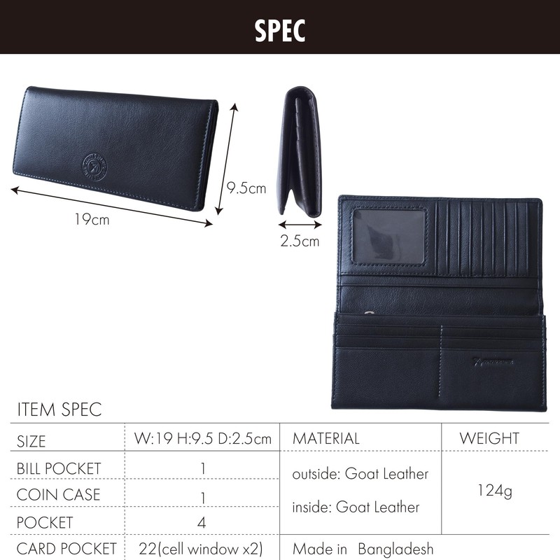 - Material: Goat leather; Size (W x H x D): 7.5 x 3.7 x 0.1 inches (190 x 95 x 2.5 mm); Specifications: Card pockets x 22, pockets x 4, bill compartment x 1, coin purse x 1