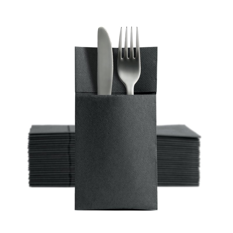 Aroba 50 Soft Point Cutlery Napkins, Soft Material, Volume and Structure, Ready Folded Napkins with Slot, 39 x 38 cm, 1/8 Fold Cutlery Bag, Good Quality, Black