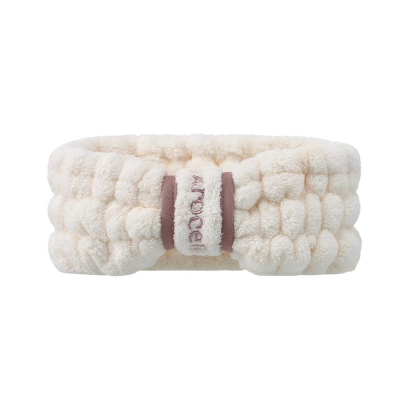 The Arocell Cleansing Headband is a luxurious and plush accessory designed for comfort and functionality during skincare routines. This cream-colored headband features a soft, sherpa-like texture and a quilted appearance, ensuring a cozy fit. It is accented with a mauve central band that has the brand name "APOCELL" elegantly embroidered on it. Ideal for keeping hair away from the face, this headband not only enhances your skincare experience but also adds a touch of style to your self-care rituals.