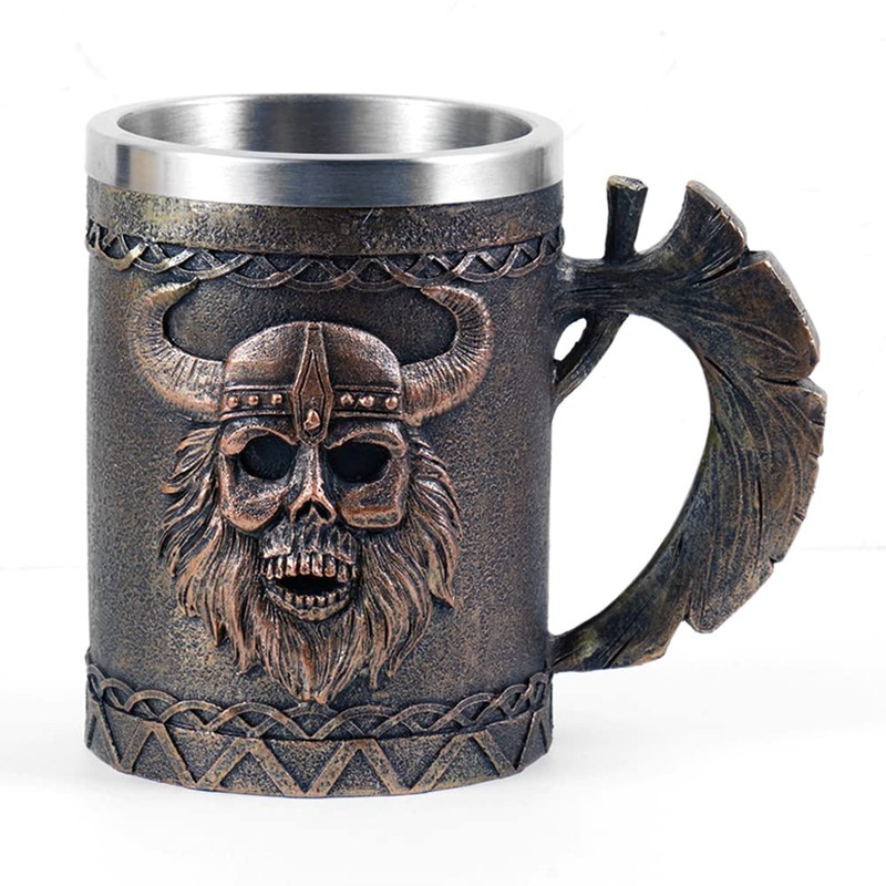 Arola Taza de hacha vikinga, taza de cerveza de calavera de cuerno de acero inoxidable, taza de calavera de guerrero vikingo, taza de café, taza de cerveza, taza de calavera medieval, taza para café, bebida, jugo, regalo de 17 onzas para hombres