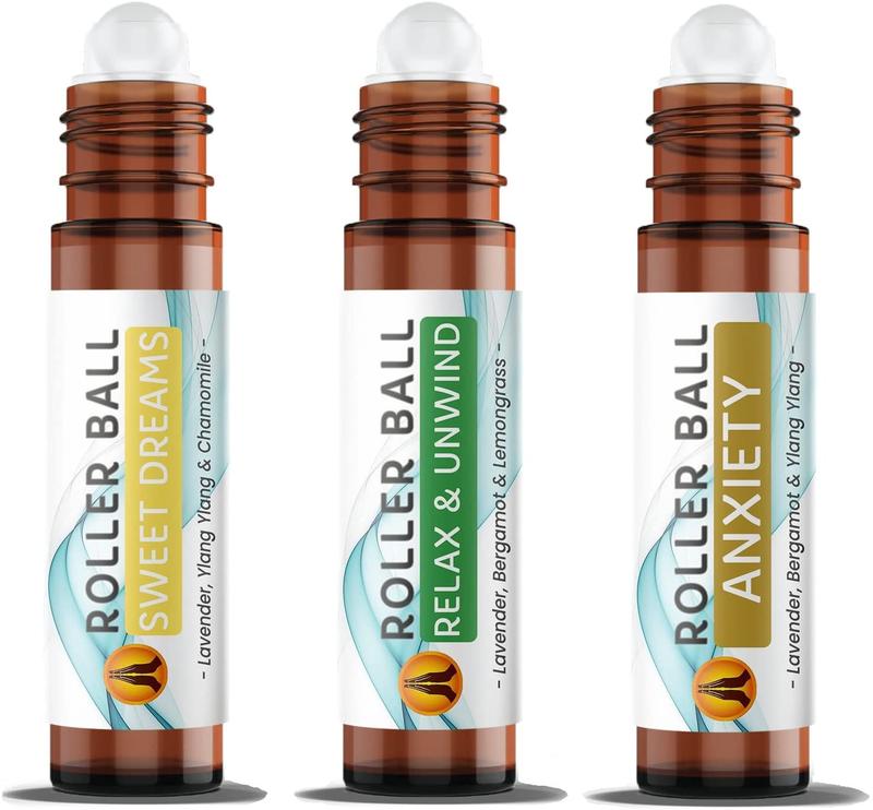 Aroma Energy - Anxiety Essential Oil Roller Ball Set - 3 x 10ml Roll On Pulse Points Rollerballs - Anxiety, Sweet Dreams, Relax & Unwind - Gift Box - Vegan - UK - Aromatherapy - Massage Oils - Essential Oils - Christmas Gift Sleep Calming Oil For Her Him