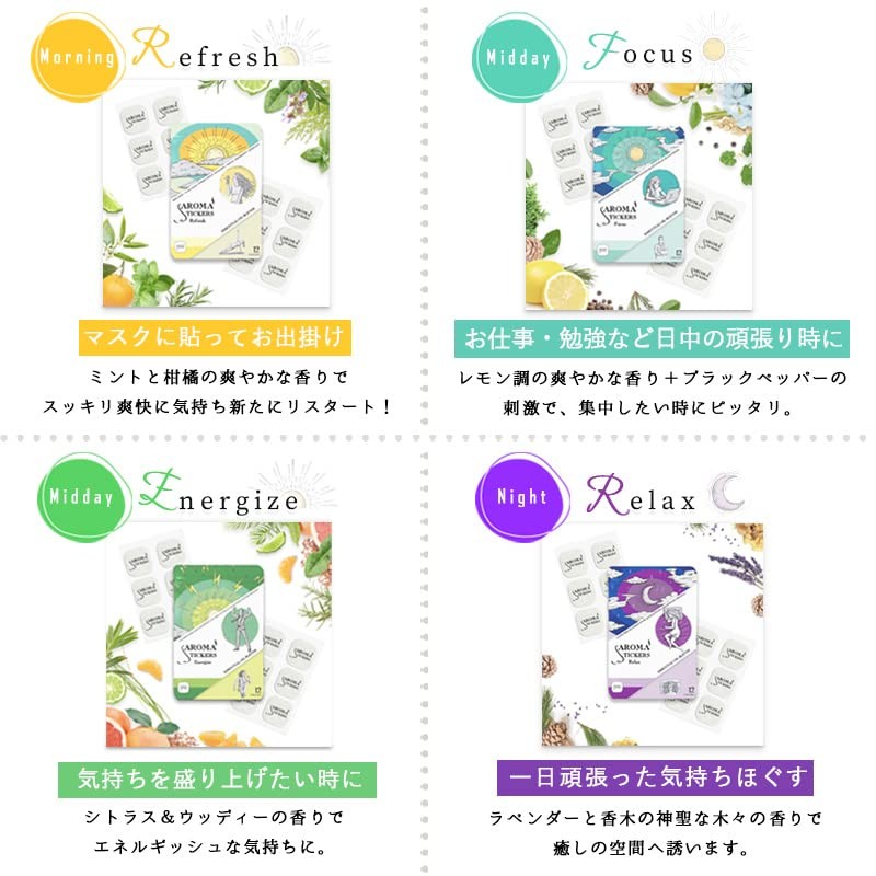 The Aroma Stickers Blend Series uses only 100% natural aromatic oils to suit the occasion.