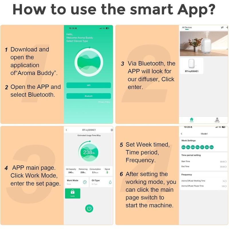 • Smart Schedule & Timer Mode - You must shoude experience Customize Your Fragrance Plan from APP.Refer to IMGE Description or APP Manual Guide) That is so easy. Besides,the aroma diffuser offers 3 intensity levels and 4 timer settings (2H/4H/8H/continuous) with Indicator Lights feedback. So not pnly APP but via machine button, you can easy DIY your aromatherapy diffuser effortlessly.