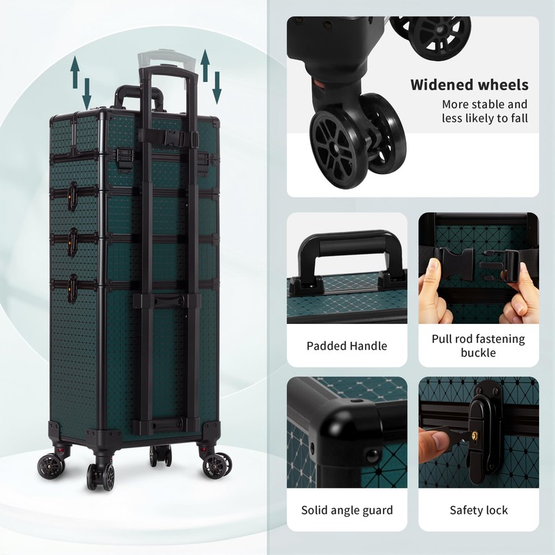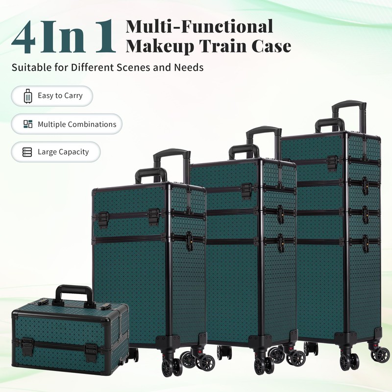 AROUS Rolling Makeup Train Case 4 in 1 Cosmetology Case on Wheels Large Storage Cosmetic Trolley with Key Salon Barber Case Traveling Cart Trunk, Green