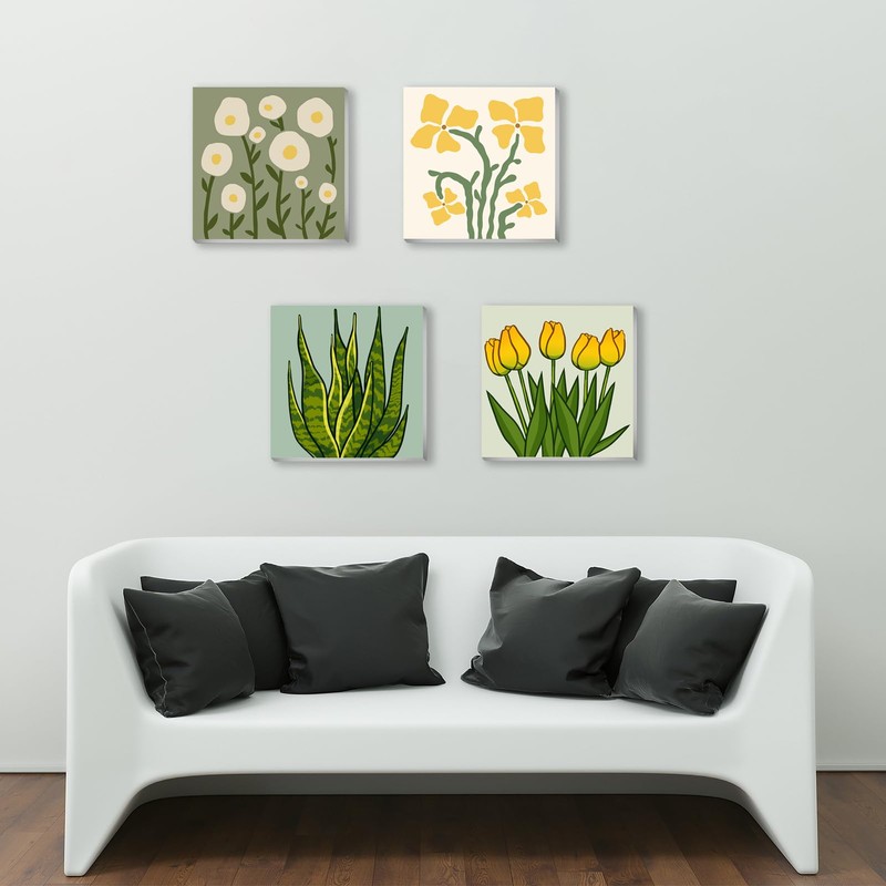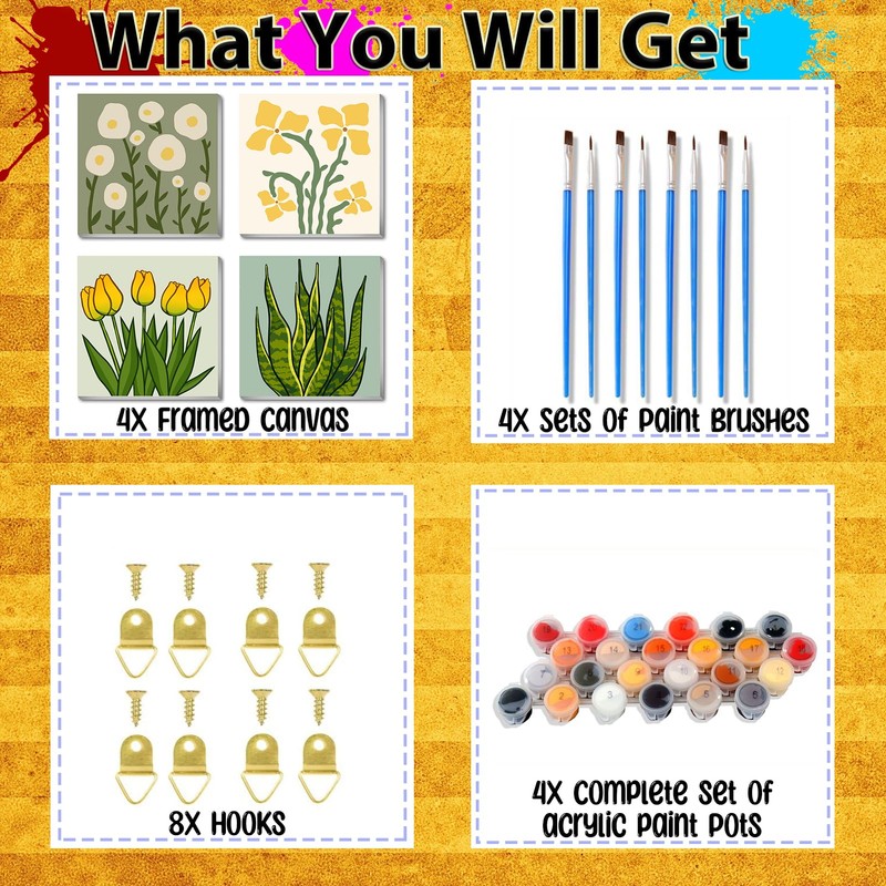 - 【Paint by Number Kits Includes 】With the purchase of 4 pack floral paint by number kits you will get: 4 pre-printed textured art canvas(Canvas Framed),4 set of acrylic paints,4 set of paint by number brushes,4 set of hooks.You only need to color according to the numbers to complete beautiful oil paintings.Complete range of painting tools, allows you to draw easier and better, like a painter.