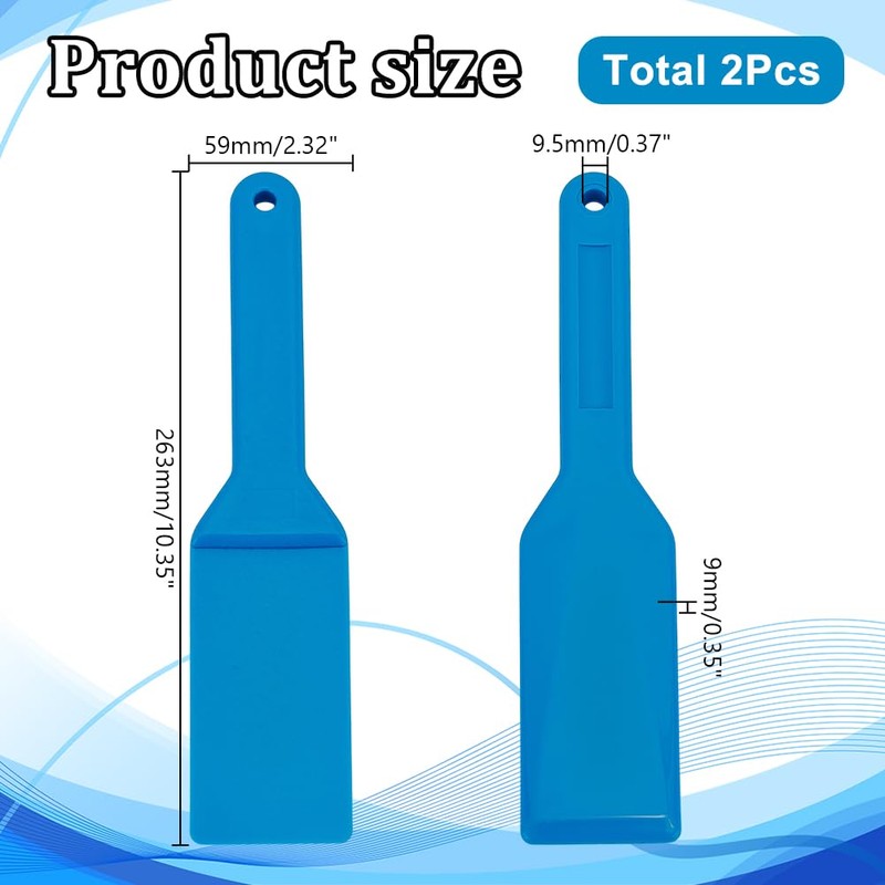 • Package Included -- You will receive 2 pcs blue plastic scrapers, approximately 5.9cm(2.3inch) wide, 26.3cm(10.4inch) long and 9mm(0.4inch) thick. There is a hole at the top with a diameter of 9.5mm(0.4inch), which can be hung with a rope for convenient placement