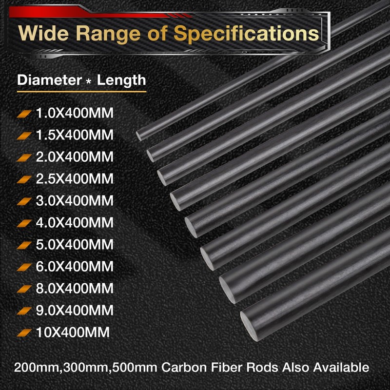 - Application: Carbon Fiber Rod are suitable for aviation model aircraft, model cars, multi-rotor support rods, model boats, racing cars, robots, DIY aircraft production, 3D printers, arrow rods, kites, windmills, sails, DIY subject support poles, mosquito nets, Tents, bows, hatches, PCB equipment shafts, luggage, hand rods.