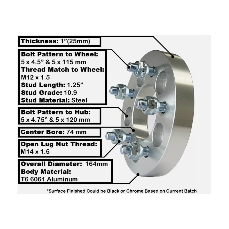 Four (4) Wheel Adapter Spacers | Thickness: 1" Wide | Vehicle Bolt Pattern: 5/120.65 (5/120.7 or 5/4.75") | Wheel Bolt Pattern: 5x114.3 (5x4.5") | Hub Center Bore: 73.1mm | Stud/Nut Thread Pitch: 12x1.5 | [MATERIAL & MANUFACTURING] Spacers are CNC Machined to exact specifications from high quality Aerospace Billet Aluminum. Undergoes anodizing process to prevent surface corrosion and rust. Includes heat treated 10.9 grade carbon steel studs.