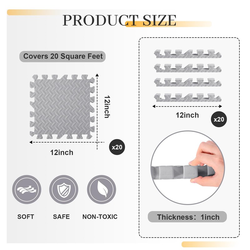 - Interlocking Play Mats: you will receive 20 grey thick foam floor mats; Each square floor tile measures 12x12x1 inches / 30x30x2.5 cm; The quantities and colors are sufficient to meet your home floor decorative, protective and replacement needs
