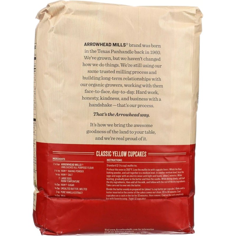 Make Arrowhead Mills Organic Unbleached All Purpose Flour a staple in your pantry. Our flour is made from hard red winter wheat with no shortcuts. It's perfect for everything from bread to cake to pastry. Each serving of our flour gives you 4g of protein. It's verified non-GMO and certified organic by the USDA. Includes one 80oz bag of Arrowhead Mills Organic Unbleached All Purpose Flour. See nutrition facts panel for allergens. As Arrowhead Mills has grown, our brand and our product line have grown with us. Over the years, we've added hot and cold cereals, as well as delicious pancake, waffle, cake and brownie mixes; nut butters; seasonal products; and gluten-free products - all of which taste great, are all-natural and are entirely free of chemical pesticides and herbicides.