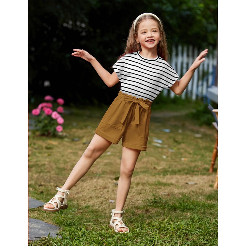 Arshiner Girls 2 Piece Outfit Summer Clothes Cute Drop Shoulder Batwing Sleeve Tops and Paperbag Waist Shorts Set Size 8-9