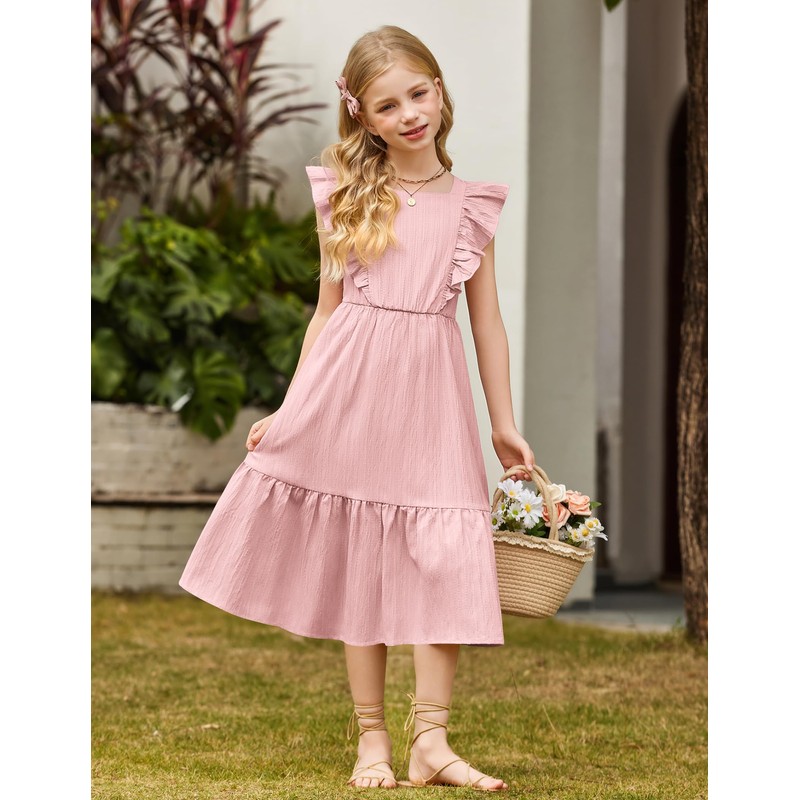 Arshiner Girls Summer Dress Pink Easter Party Boho Tie Back Square Neck Swing Flowy Tiered Maxi Dresses for 10-11 Years