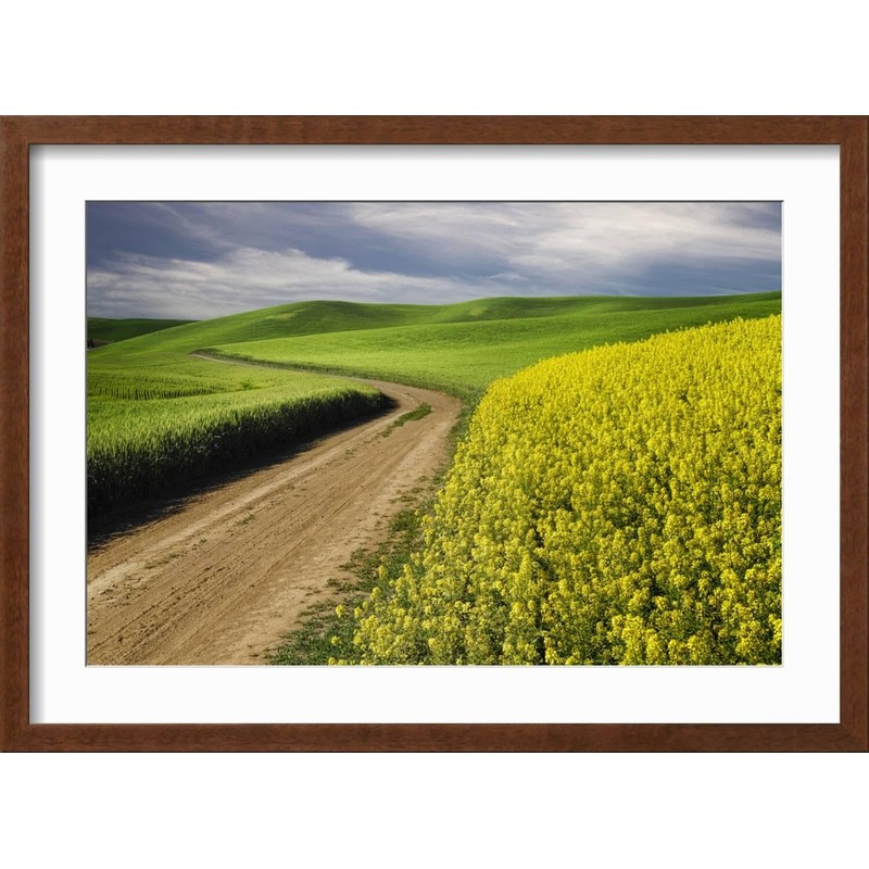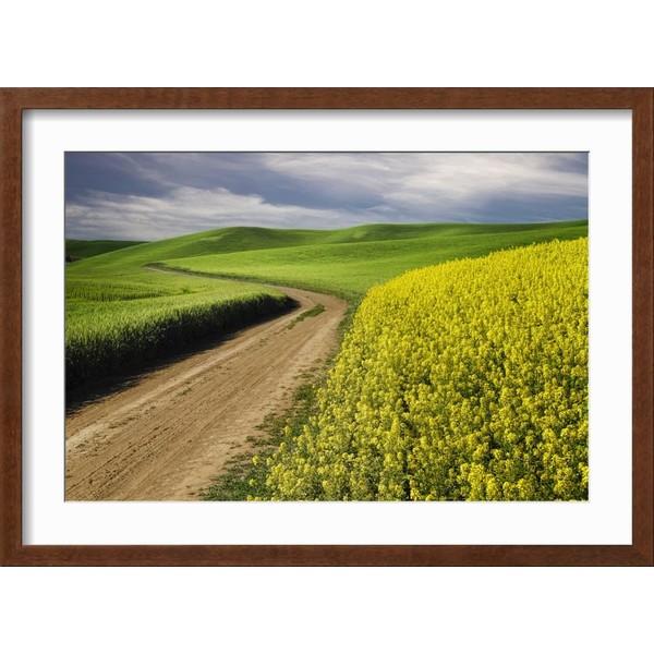 ART.COM Wall Photographic Print Rural farm road through yellow canola and green wheat crops, Palouse region of eastern Washington. on Brown Frame by Adam Jones, 23" x 17"
