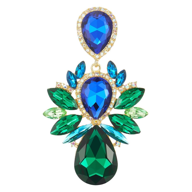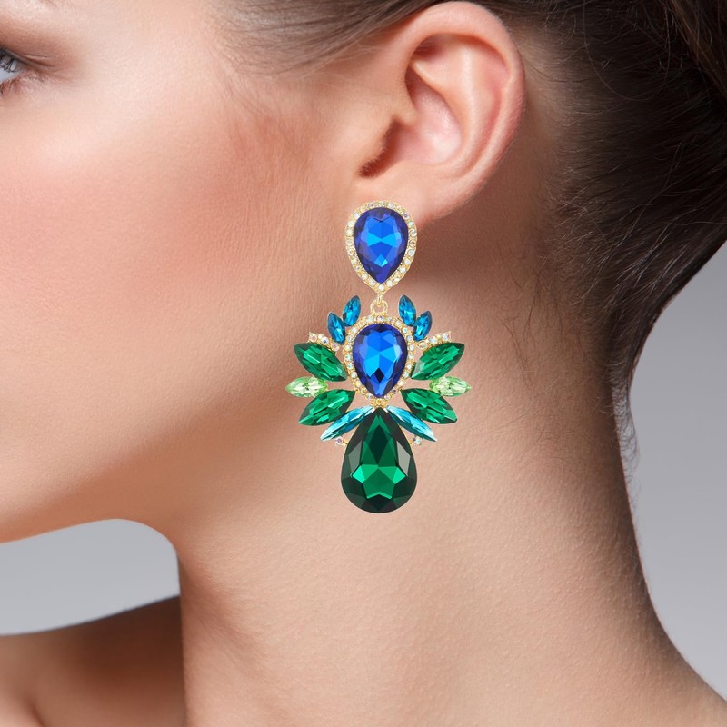 - Art Deco Baroque Large Earring Crystal Rhinestone Cluster, Color of Blue and Emerald, Fashionable