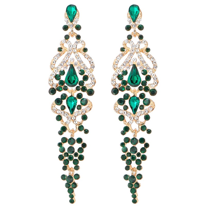- Art Deco Long Dangle Statement Earring Green Crystal Rhinestone Cluster Chandelier, Party Prom