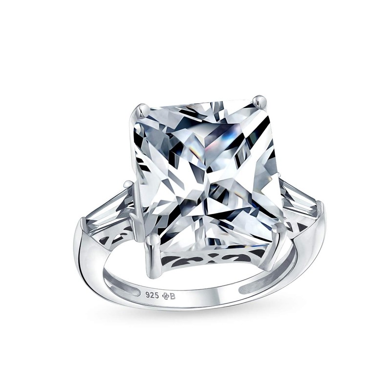 - GORGEOUS DESIGN - This luminously majestic sterling silver engagement ring will take her breath away. Accented by a flawlessly gleaming princess cut cz center stone with finely detailed shimmering baguette cut czs on either side.