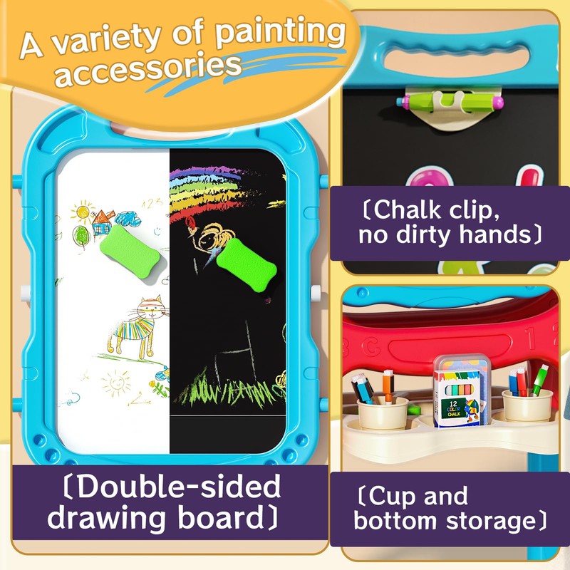 - Height Adjusting&360° Rotation & Double-Sided Design:Grow with your toddler! The height adjusts from 26.38 to 34.25 inches, suiting kids at every growth stage, from toddlers to older children. Its 360° rotating, double-sided board (chalkboard + whiteboard) lets kids—even two at once—switch between drawing, writing, and play modes in seconds. And with built-in storage, you can keep all the art tools organized. No more lost markers or chalk pieces—everything has its place.
