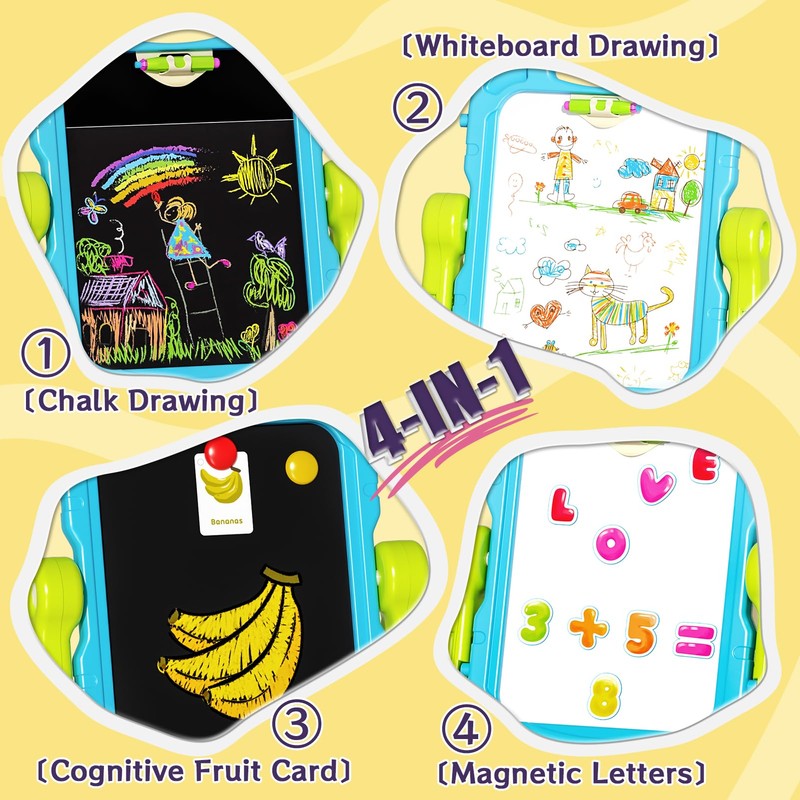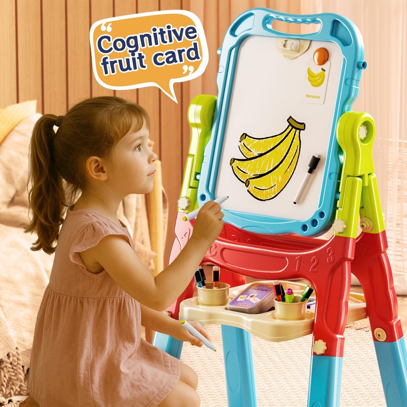 - 4-in-1 Kids Easel:This art easel for kids toddlers is not just a drawing board! It combines chalk drawing (on the blackboard side), whiteboard drawing (with markers), magnetic letter play for early reading and math skills, and cognitive card learning (like fruit cards to expand knowledge). Plus, it can be disassembled and converted into a tabletop easel. One drawing board, multiple ways to play and learn.