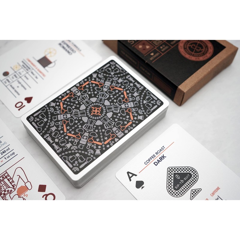 - PREMIUM QUALITY INFORMATIONAL CARDS - Standard 52 U.S. Poker-size cards (2.5" x 3.5") packed into a 56-card deck. All cards are made of premium casino grade, 310gsm linen-finished, black-core paper stock to ensure the best quality handling, durability, and playability. Additionally, a unique kraft material tuck box with custom-printed interior, is made of a heavy-weighted eco-friendly card stock that captures the visual aesthetics of a roaster's coffee bean bag.
