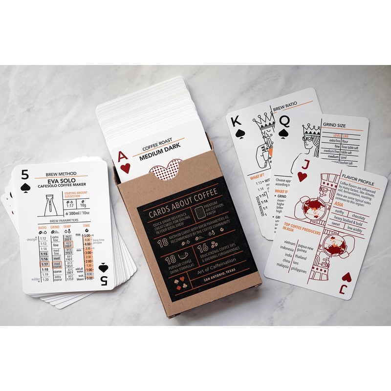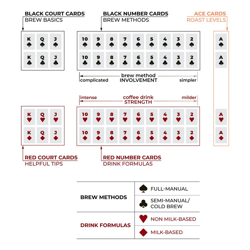 - IN THE BOX - The Standard Edition card deck contains 1 introduction card, 2 unique cheeky Joker cards, 1 unit conversion reference card for volume weight and temperature, 18 coffee-making method cards with their own brewing parameters, 18 drink formula recipe cards, and 16 educational tips cards.