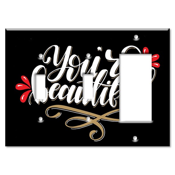 - MADE IN THE USA: 3-Gang Combination Wall Plate - Toggle - Toggle - Decora - You're Beautiful image printed on a solid metal switch plate.