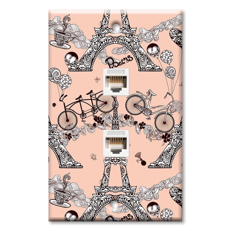 Art Plates - Two Port RJ45 Ethernet decorative printed keystone style wall plate. Works with Cat5 through Cat8 cables. Female to Female Connections. - Eiffel Tower with Bicycles