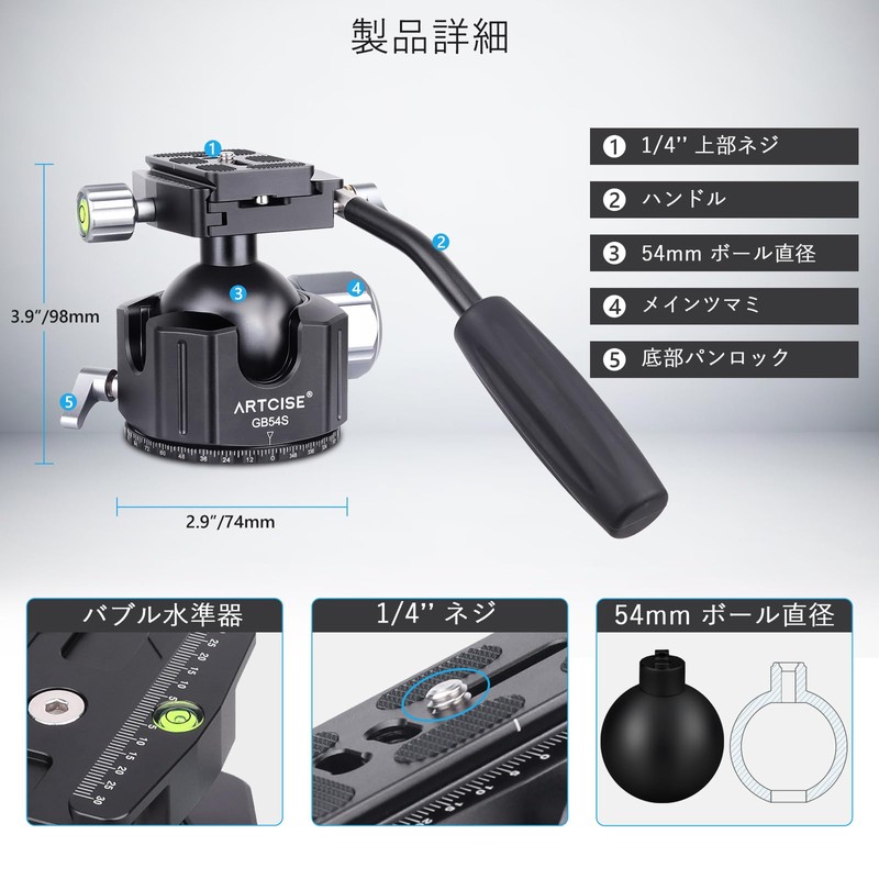 - Tripod ball head with a more stable low center of gravity design: The center of gravity is about 15% lower than other ball heads, and the diameter of the 2.1 inches (54 mm) ball provides good stability and high fixation. Head weight (0.86 kg), bottom diameter (3.4 inches (86 mm), height (3.8 inches (97 mm), maximum load (55 kg), extra Arca Swiss standard quick shoe