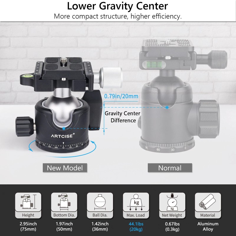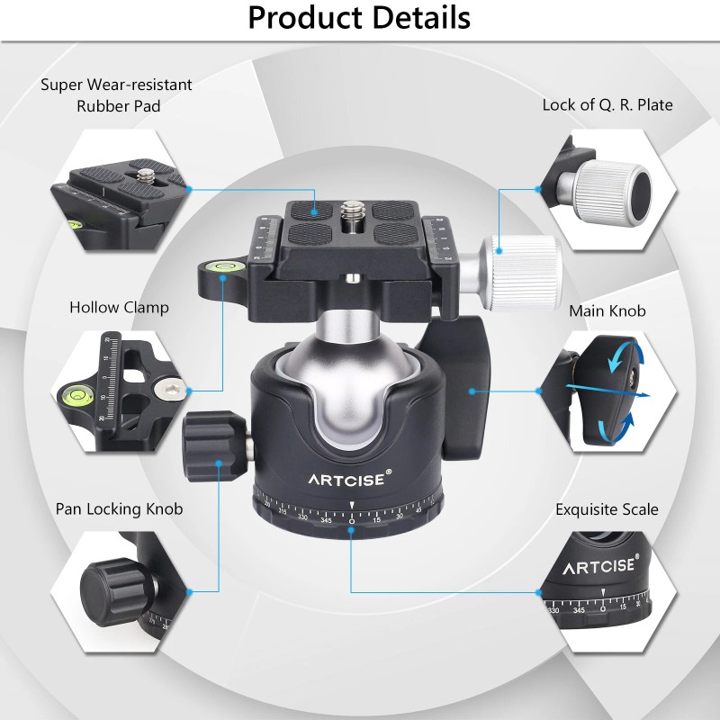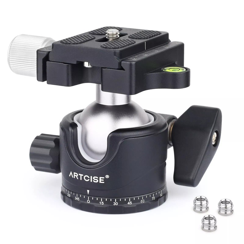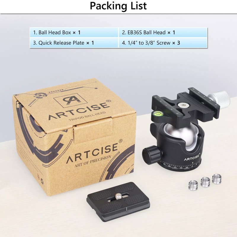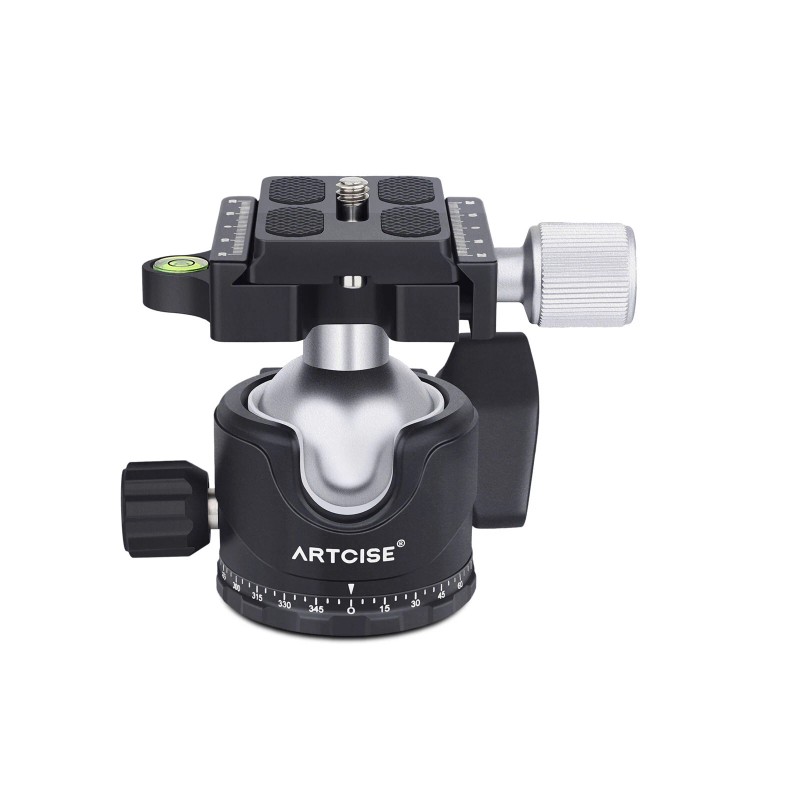 Low Profile Ball Head 36mm Stability Panoramic Tripod Head 360 Rotating Professional All Metal Ballhead with 1/4 inch QR Plate for DSLR Cameras Tripods Monopods Camcorder Slider Max Loading 33lbs/15kgBrand story:The brand name ARTCISE is from the English :Art of Precision.It is determined to make every product with the attitude of creating artworks to achieve the ultimate precision,and constantly improve the stability,reliability and operation feel of every photographic equipment product. The most popular and representative products of ARTCISE are AS, CS, CT series Tripod. It is characterized by a lightweight but high-strength carbon fiber material, a large and sturdy top plate, and an original 40mm tripod leg tube.The ball head produced by ARTCISE are made of high-quality aluminum alloy, using international advanced CNC machining technology, and the original low center of gravity design. ARTCISE ball head are smooth, durable, and sturdy, both artistic and practical.Features:✅【HIGH STABILITY LOW GRAVITY CENTER BALL HEAD DESIGN】: Its locking structure has been moved to the side of the tripod ball head, the center of gravity has been reduced by 15%, the design made it has better stability. Max loading: 33lbs/15kg, bottom diameter: 1.95in/49.5mm, ballhead height: 3.07in/78mm, Net weight:0.62 lbs/0.28kg. Its security slot protects your camera at all times.✅【HIGH QUALITY ALL-METAL TRTIPOD BALL HEAD】: High-quality all-metal ball head, Aluminum-Alloy Material, the sphere’s diameter is 36mm, CNC super machining, multi Anodized Surface treatment with the lighter weight, the smoother hand feel, more stronger loading capacity and more excellent durability. Knob anti-lost design lets you no longer have a risk of losing the knob.✅【PRECISION ADJUSTMENT PANORAMIC BALLHEAD】: 360 degree horizontal rotation panoramic head, double locking knob design, Especially the ergonomic main knob ,Flexible and Effortless operation; Scale on the pan and bottom for panoramic shoots. Built in dual bubble level indicators: Aiming and horizon leveling, can be accomplished as one instinctive motion.convenient for photographers to take panoramic photos in landscape photography and create magnificent panoramic works.✅【WIDE APPLICATION FREE ROTATION BALL HEAD】: There is 1 U-shaped notches on the main body of the ball head, so you can easily switch into vertical shooting from horizontal. You can use this ball head with tripod, monopod,camera slider or mini tripod,for installing camera,Camcorder,DV, mobile phone, telescope.✅【WIDE COMPATIBILITY ARCA QUICK RELEASE PLATE】: Equipped with 1/4 screw, the removable arca-swiss quick release plate is suitable for DSLR Nikon Canon Sony Samsung cameras etc, 3/8 screw hole at the bottom can be attached to tripod, monopod, slider and other stands. 3*1/4in to 3/8 in Screw adapt is included.