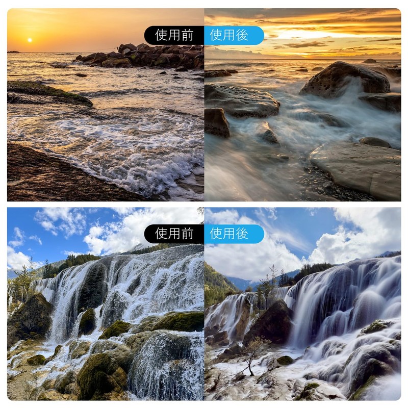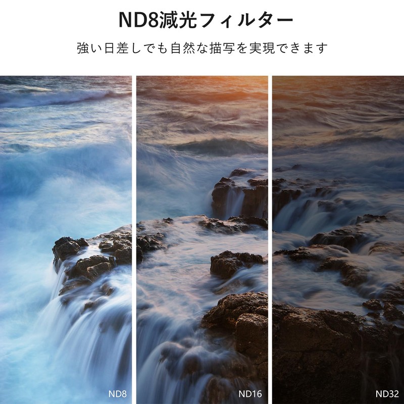 - 【シーン別最適化】ND8:夕景・薄曇りのソフト表現、ND16:滝/川の霧状水流・雲の流れ、ND32:真昼の海辺・極限露出制御。