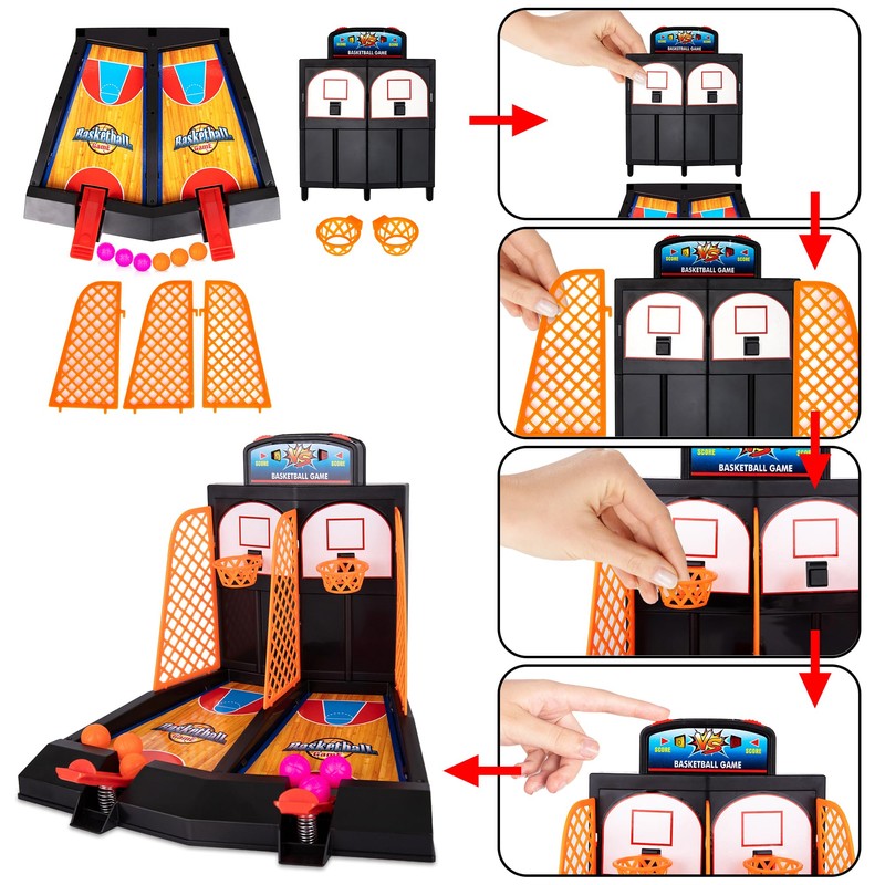 - AWESOME ARCADE FUN: A classic arcade basketball shooting game that fits on a tabletop! This set comes with 1 desktop basketball game and 6 miniature basketballs. Set it up on your office desk or tabletop at home and keep boredom at bay with every shot.
