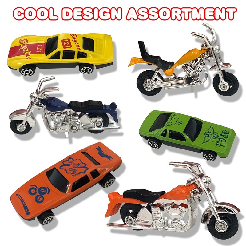 - DRIVE THEM WILD: An epic treat for mini motorheads! This pack comes with a SET OF 25 mini car and motorcycle toys in various colors and styles. With a free wheel motion and eye-catching look, these little toys are a recipe for hours of incredible fun.
