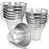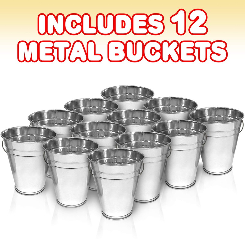 - BEAUTIFUL BUCKETS: Make that party pop or add versatility to your home with this set! It includes 12 large metal buckets with handles, each 5” in height and 4.5” in diameter. You’ll love the vintage look that resembles the galvanized metallic pails of old.
