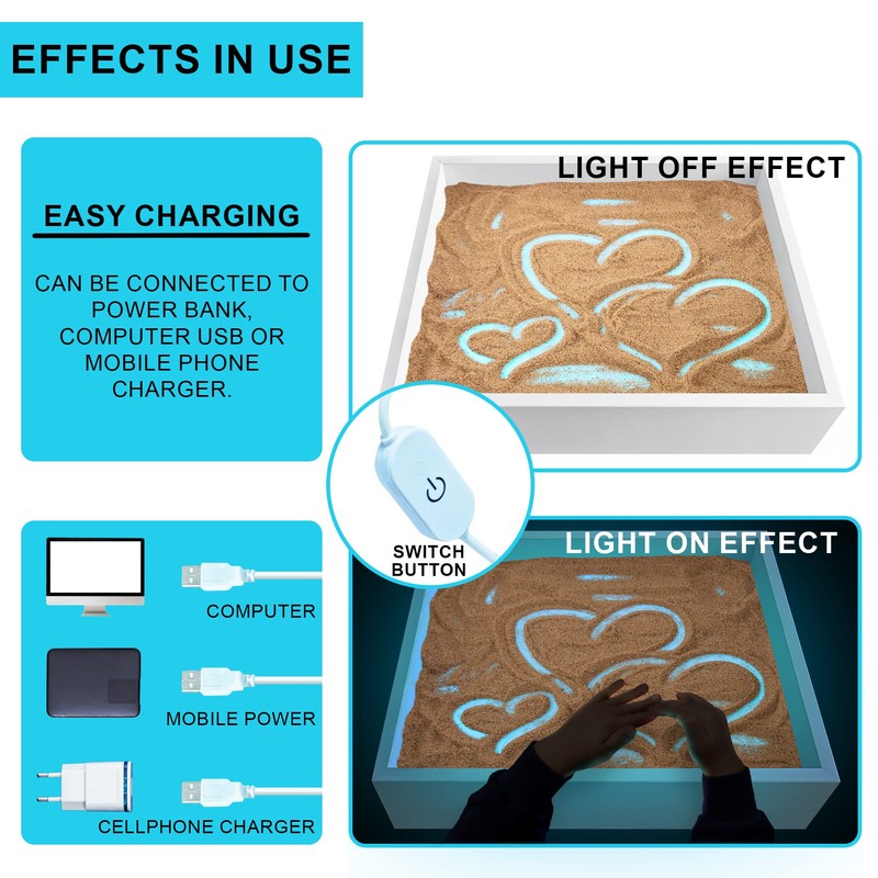- Sensory Lighting – Our sensory light table features a built-in LED panel that provides brilliant and safe illumination for hours of exploration, discovery and fun! The unique sensory light table provides a relaxing and calming atmosphere to help develop curious minds.