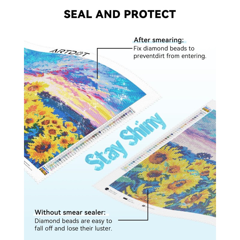 - SEALING AND PROTECTING - The glue seals the diamond beads securely onto the canvas, forming a protective film that prevents the beads from shifting or falling off, and keeps dirt out, ensuring the brilliance and integrity of the diamond painting