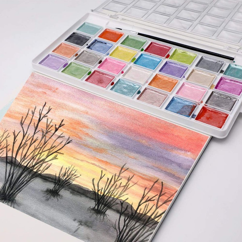 Artecho Metallic Watercolour Paints 28 Colours with 1 Brush, Portable and Easy to Use, Ideal for Artists, Hobby Painters, School, Art Lessons