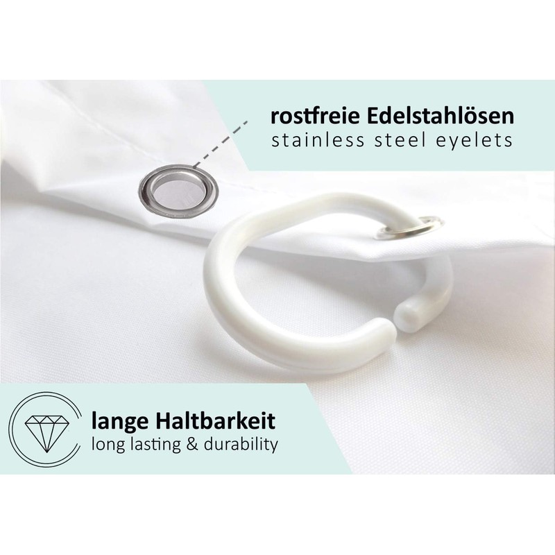 - Hygienic and easy-care: The anti-bacterial and anti-mould coating keeps the bathroom curtain clean for a long time. The bath curtain is washable at 40 °C and can be ironed on low heat. Further cleaning tips can be found in the E-book (English language not guaranteed).